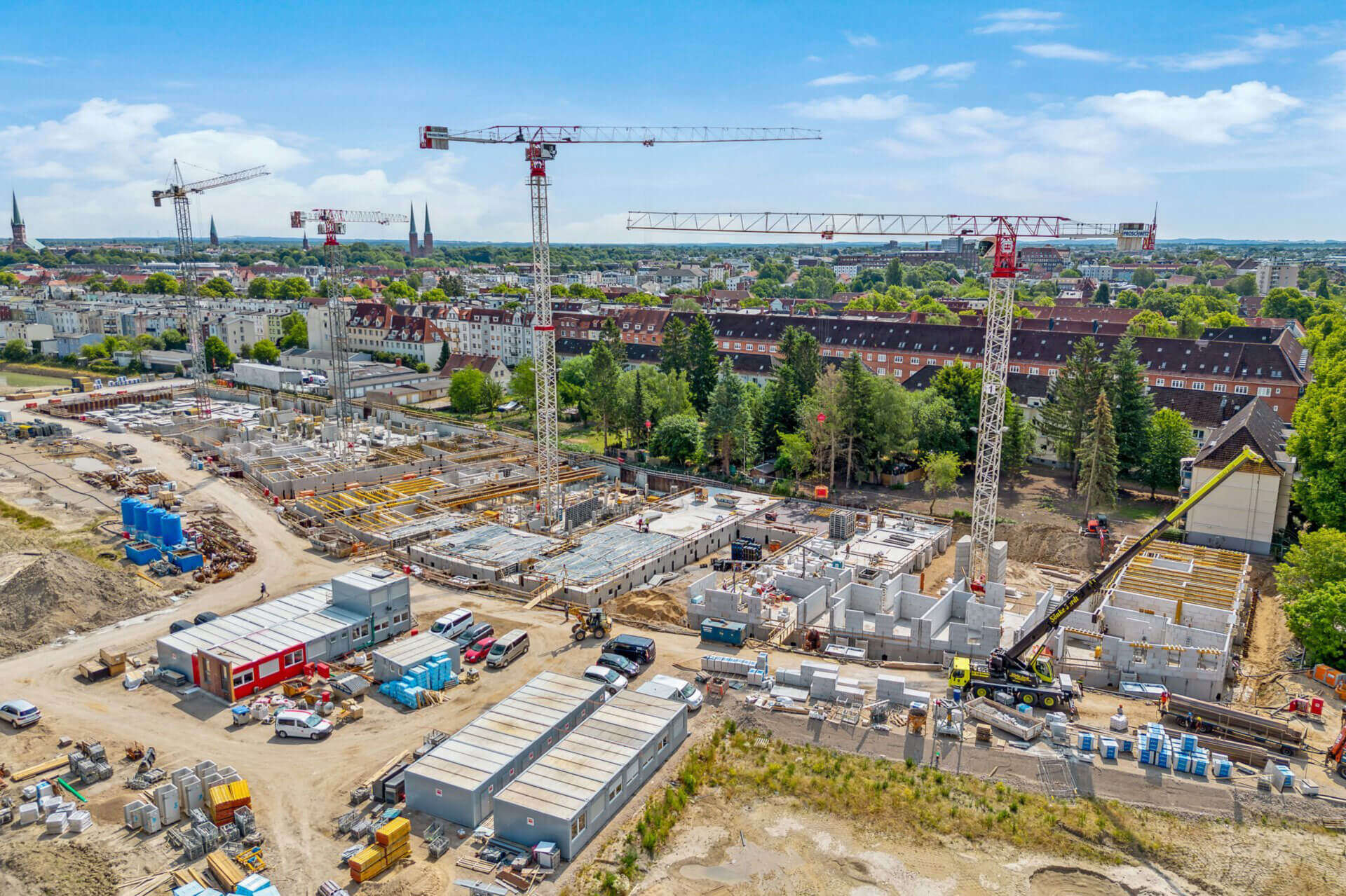 Nachdem wir im Mai 2023 den Grundstein für die Quartiersentwicklung gelegt haben, schreiten die Bauarbeiten rasant voran. Die Aufteilung der Erdgeschosse ist bereits deutlich erkennbar. Die Arbeiten an Decken und Mauerwerk laufen auf Hochtouren. Als Generalunternehmer wurde für die ersten beiden Wohnbaufelder das Unternehmen Köster Bau beauftragt.